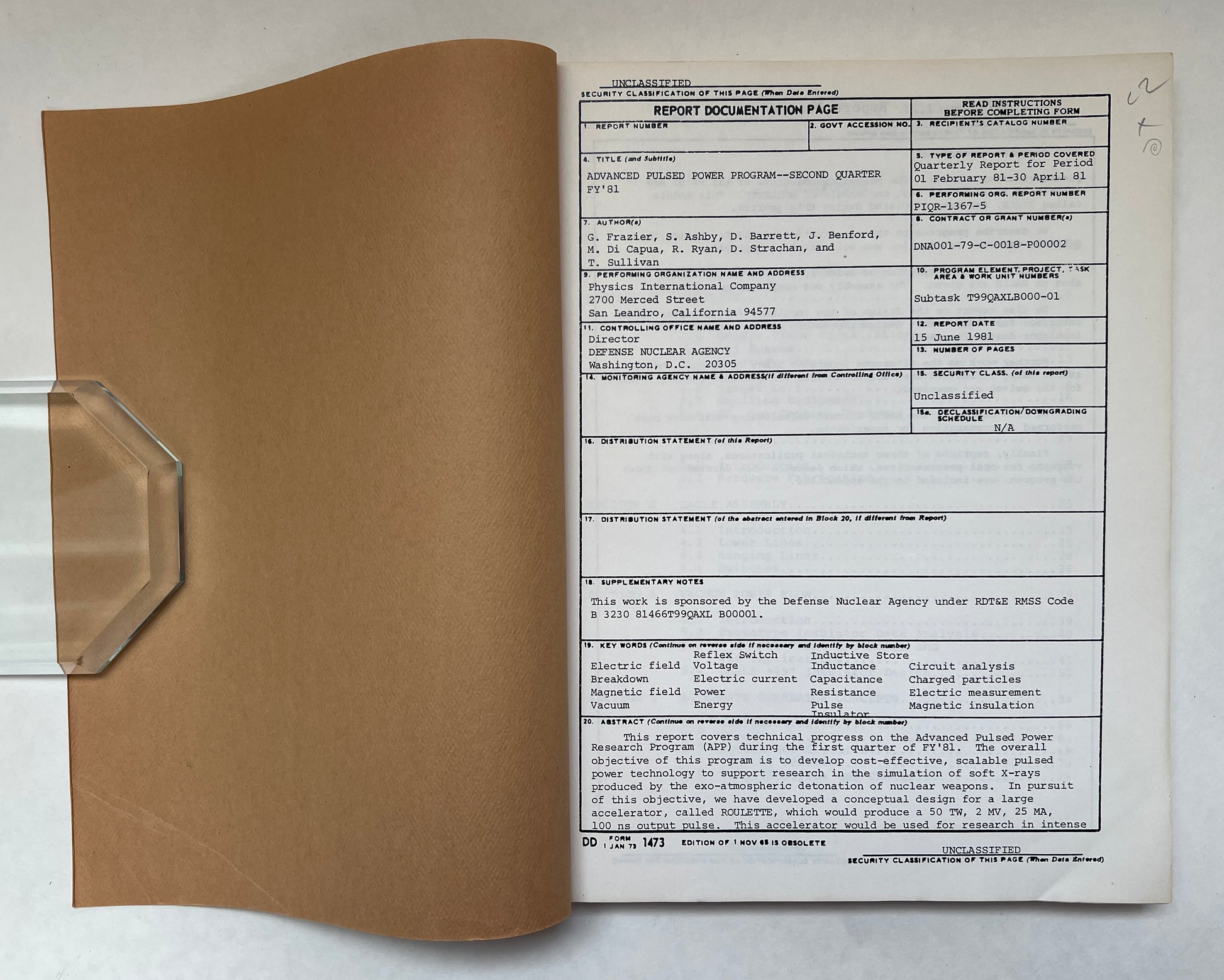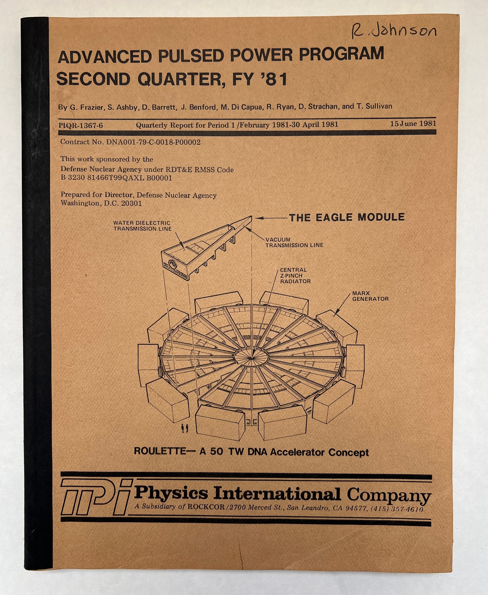 San Leandro, CA: Physics International Company, 1981. First Edition. Quarto with brown pictorial paper wraps and black spine; approx 180 pages; illustrations; appendices; 28cm Very good (+) to near fine (-); some light shelfwear to wraps; prior owner name on front of wraps. Paperback.