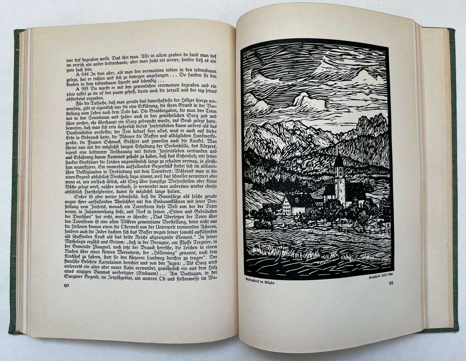 Printed in Black letter (fraktur) script. The Allgäu is a scenic region spanning southern Bavaria, southeastern Baden-Württemberg, and parts of Austria that extends from gentle pre-Alpine hills to peaks surpassing 2,000 metres in the Allgäu Alps. Shaped by ancient glaciers, its landscape of rolling moraine hills, clear lakes, and mountain pastures is renowned for dairy traditions—especially Hirtenkäse and Bergkäse—and for tourism focused on skiing, health retreats, and alpine beauty. Beyond its pastoral image, the region also sustains advanced industry, notably Fendt tractors from Marktoberdorf, while cultural landmarks such as Neuschwanstein Castle crown its blend of nature, craftsmanship, and legend.
