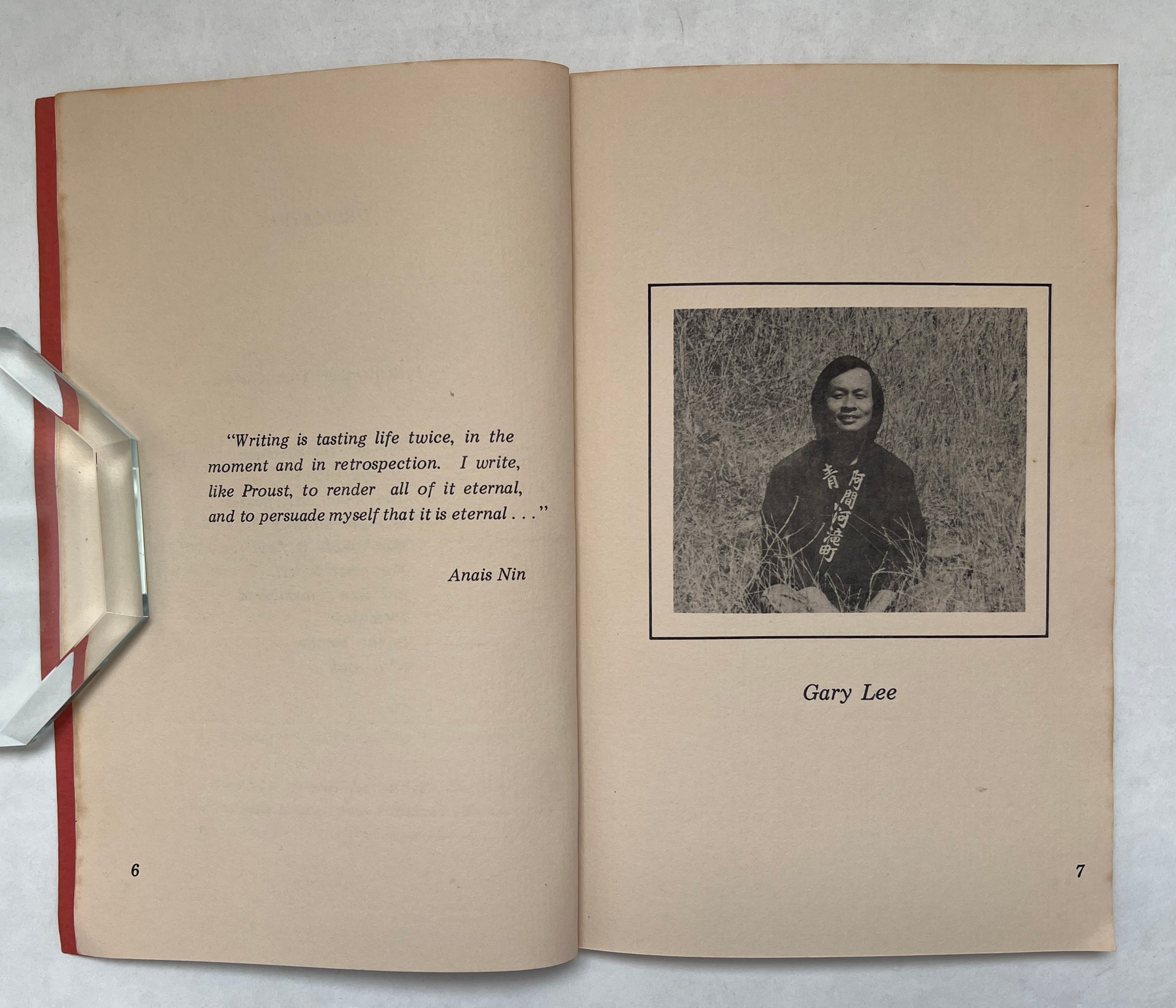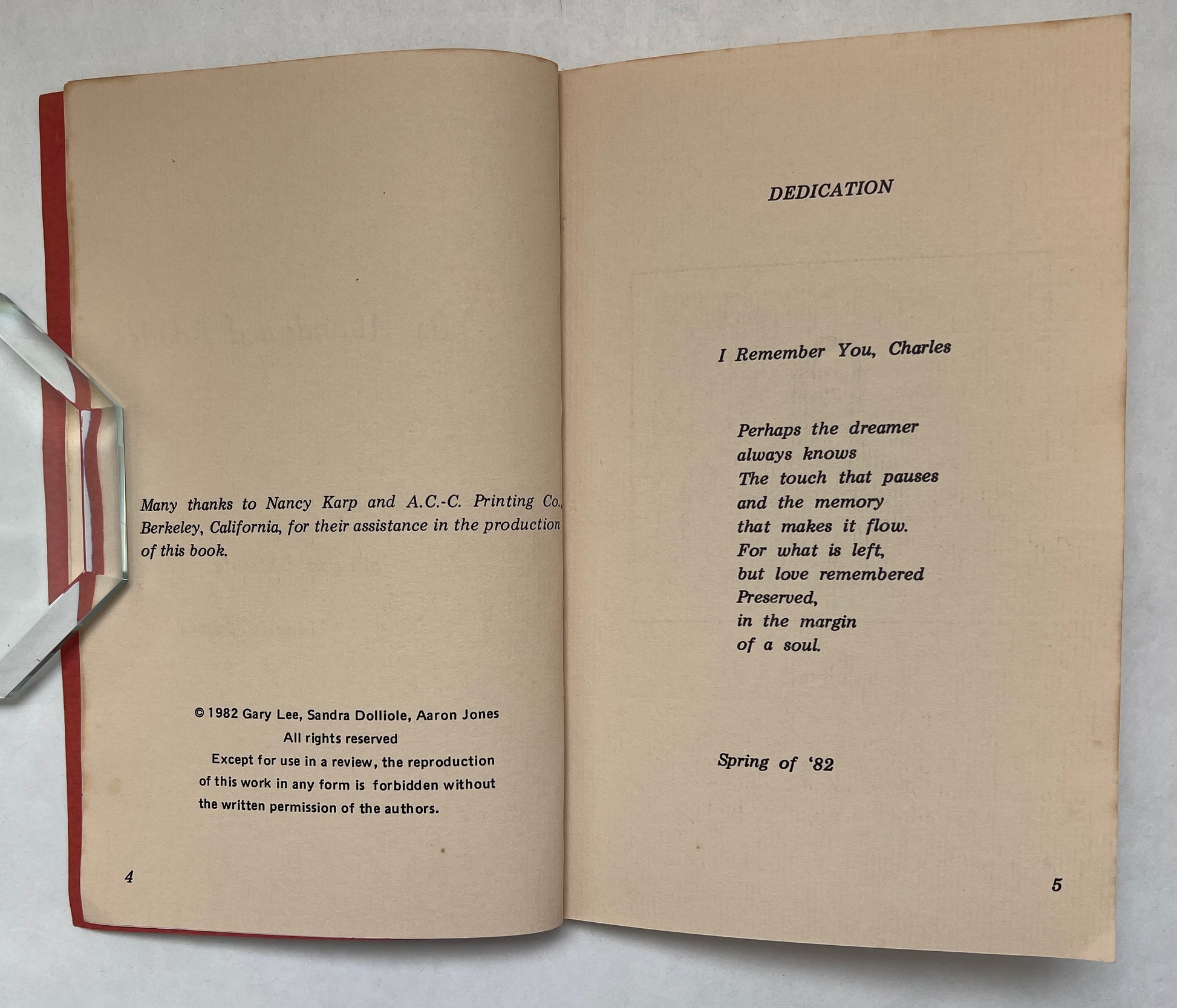 Berkeley, California: Lee, G.; Dolliole, S.; Jones, A., 1982. First Edition (presumed; no prior editions or printings cited). Octavo in red wraps; 60 pp: photograpghs (b&w); 22 cm Very good(+); faint discoloration to front wrap, else clean; inked signature to free endpaper; mild toning to pages; binding tight. Paperback.