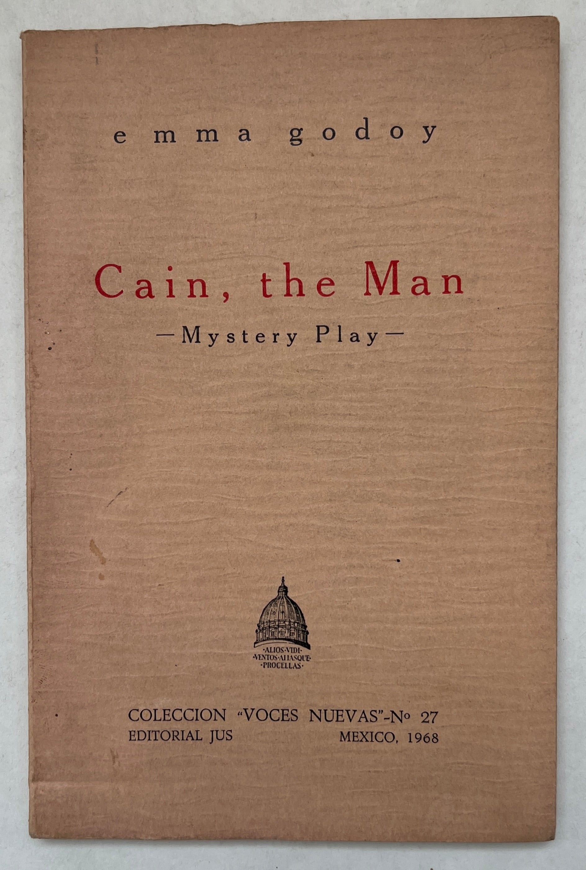 Translated by Rev. Jerome Post, S.J. and Isabel Gibbon | Stated fourth edition, 1,100 copies printed | Emma Godoy Lobato (1918–1989) was a Mexican writer, philosopher, educator, and public intellectual whose work ranges across poetry, fiction, drama, and essay, distinguished by its metaphysical gravity and ethical seriousness. Educated in Mexico and Paris, she brought existential and spiritual inquiry into dialogue with modern social conditions, often interrogating solitude, eroticism, freedom, and moral responsibility. Her best-known dramatic work, Cain, the Man (Caín, el hombre, 1950), reimagines the biblical Cain not as a mere fratricide but as a tragic figure emblematic of alienated modern humanity, caught between conscience, labor, and metaphysical exile; the play achieved notable international circulation and scholarly attention. Beyond literature, Godoy was a pioneering advocate for the dignity of the elderly in Mexico, founding organizations and influencing public policy, a civic commitment that mirrors the moral urgency and humanism of her writing.