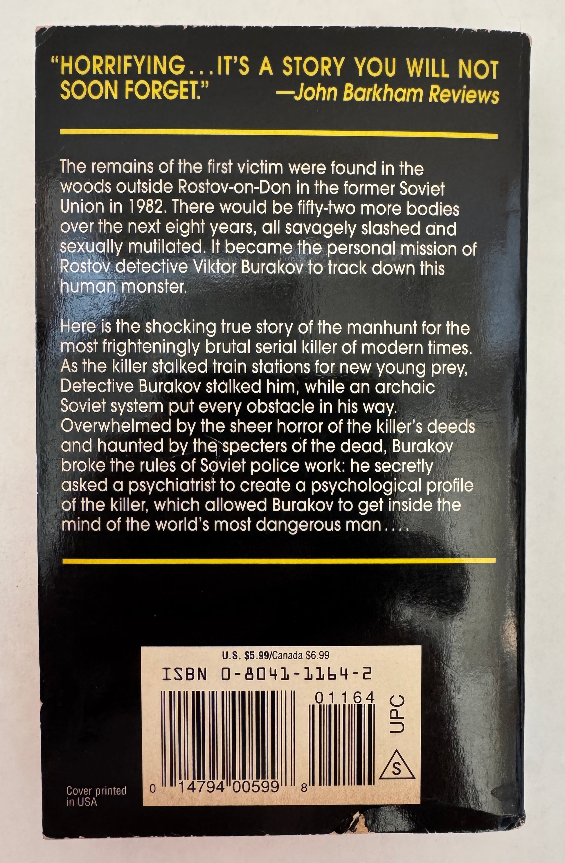 Formerly titled "The Killer Department". The story of Detactive Viktor Burakov's eight-year hunt for the most savage serial killer in Russian history. "As the killer stalked train stations for new young prey, Detective Burakov stalked him, while an archaic Soviet system put every obstacle in his way. Overwhelmed by the sheer horror of the killer's deeds and haunted by the specters of the dead, Burakov broke the rules of Soviet police work: he secretly asked a psychiatrist to create a psychological profile of the killer, which allowed Burakov to get inside the mind of the world's most dangerous man..." --Back cover.