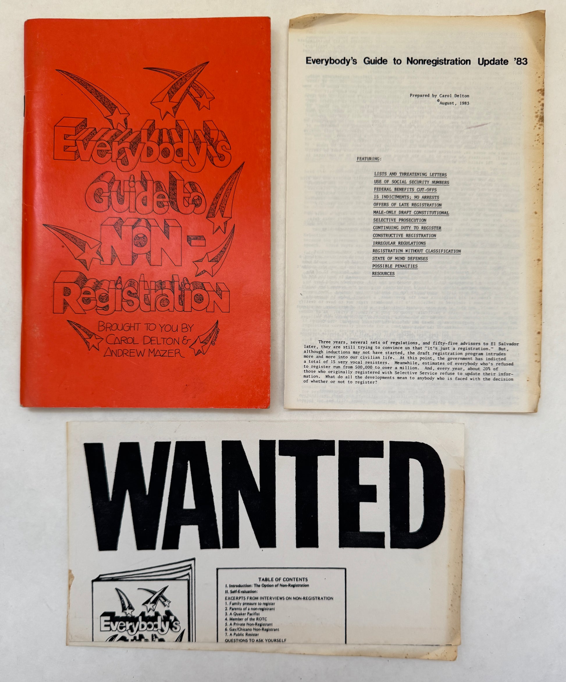 "We wrote this book for everybody who is concerned with the issue of registration with the Selective Service System (SS) but most especially for the men born during the early 1960s who are now facing the decision of whether or not to register, and for draft counselors who work with those men. We say "men" because the present Selective Service registration only includes men: but that, like other aspects of the law, may change in the near future.". Includes 1983 update sheet and promotional poster.