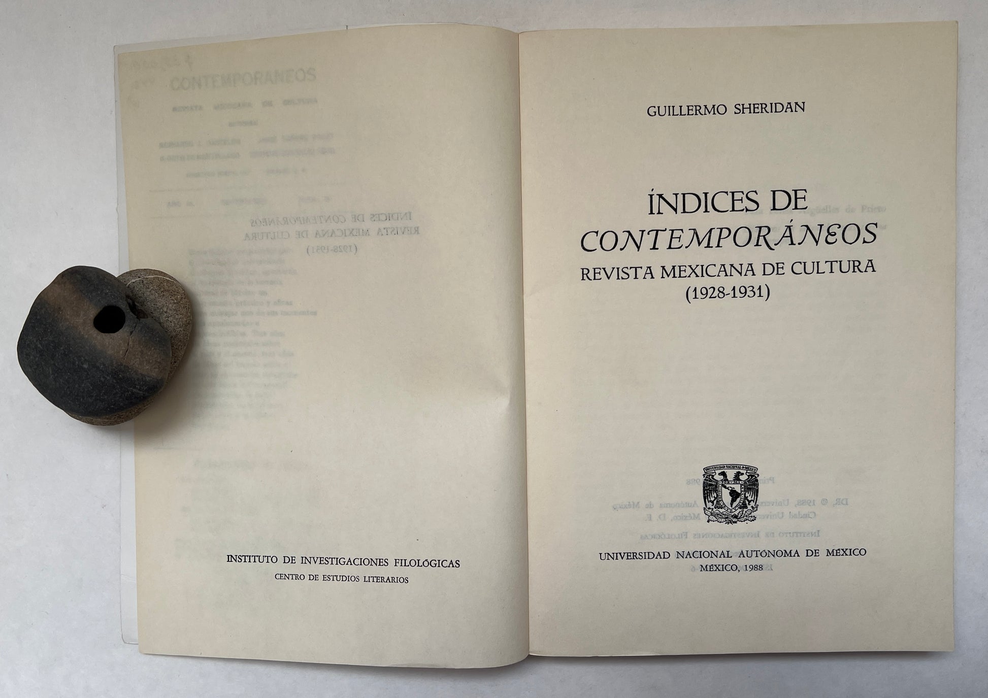 In Spanish. Scarce. "Incluye un comentario preliminar que describe las colaboraciones a la revista por género; índices de ilustradores, traductores, libros y revistas reseñadas, colaboradores, materias y contenidos; detalladas descripciones de cada colaboración publicada por la revista; índices generales"--Cover. ¶ "Los Contemporáneos (which means "The Contemporaries" in English) can refer to a Mexican modernist group, active in the late 1920s and early 1930s, as well as to the literary magazine which served as the group's mouthpiece and artistic vehicle from 1928 to 1931. In a way, they were opposed to stridentism." -- Wikipedia.