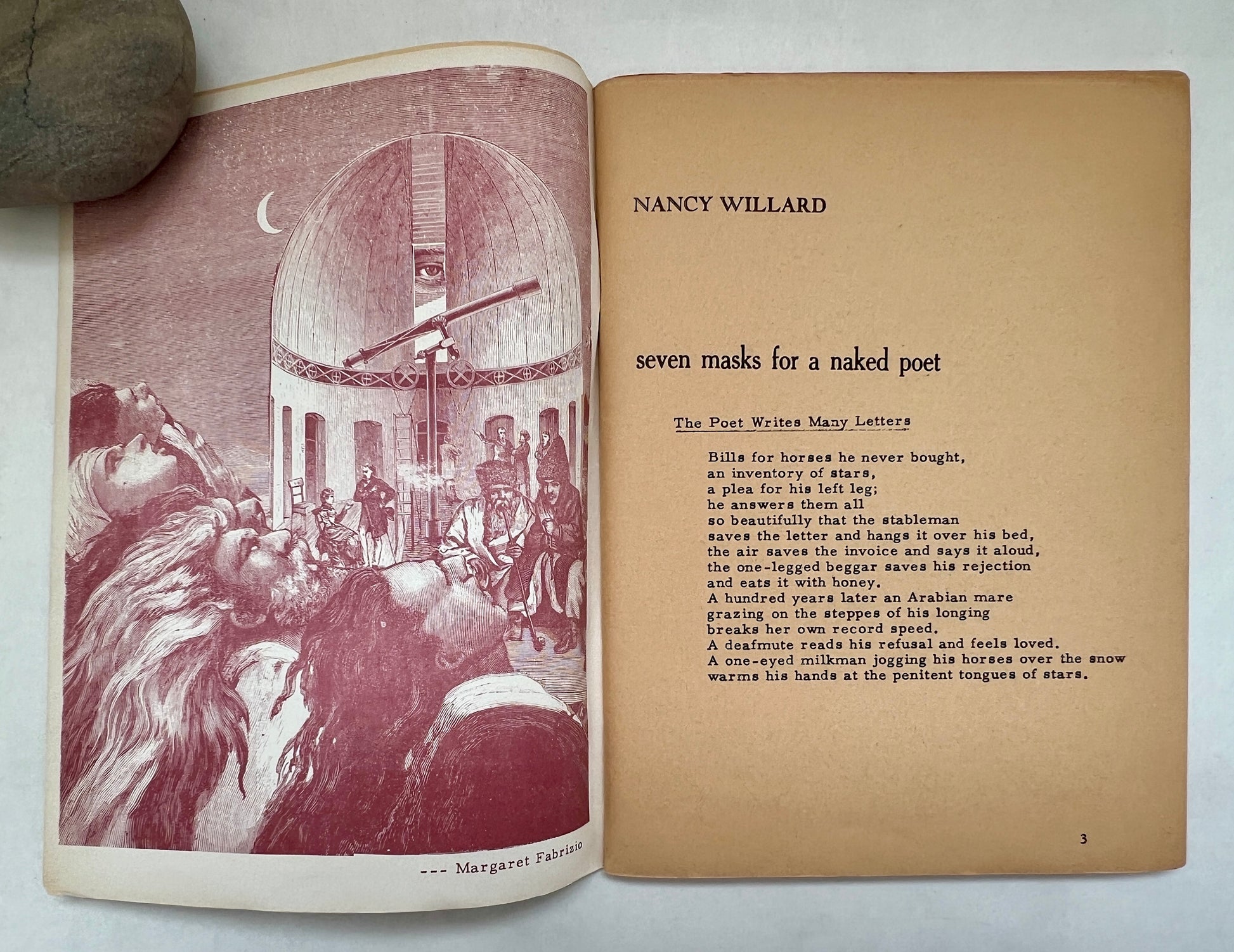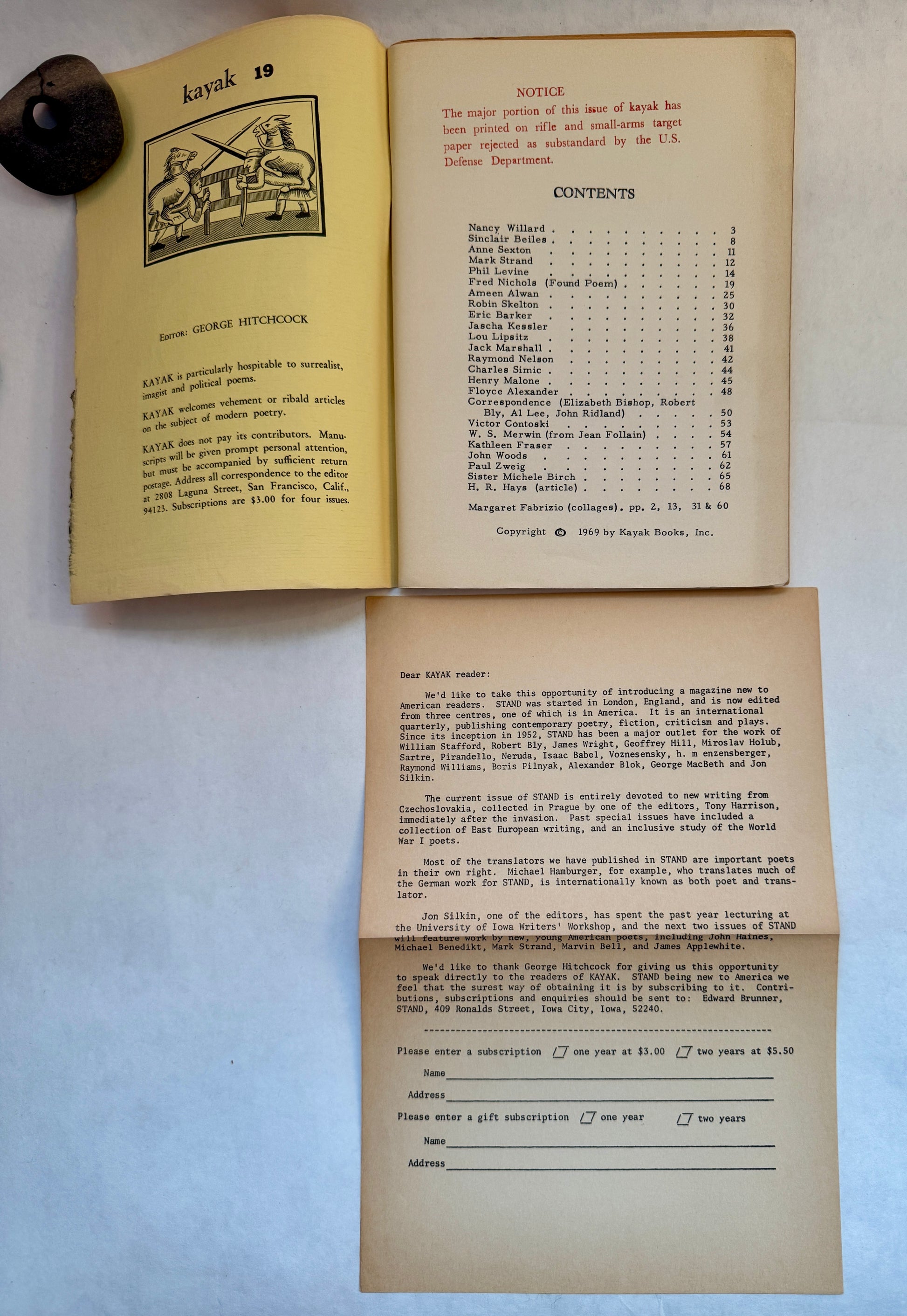 Heavily illustrated. Charming collage illustrations by Margaret Fabrizio. Includes original letter to subscribers. See photos for tabel of contents or list of contrubutors. | George Hitchcock (1900–1999) was an American poet, printer, and publisher best known as the founder of the Kayak Press and editor of Kayak, a fiercely independent poetry journal launched in 1964. Working largely from Big Sur, he championed a handmade, artisanal approach to printing that fused letterpress craft with an uncompromising literary stance, publishing and promoting voices often neglected by mainstream outlets. His own poetry, spare and incisive, reflects a modernist temperament shaped by isolation, rigor, and a distrust of literary fashion. Through Kayak and the press that surrounded it, Hitchcock exerted an influence disproportionate to its scale, becoming a key figure in the West Coast small-press movement of the mid-to-late twentieth century. | American poetry magazines; poetry journals, poetry serials. California poetry,1960s-1970s