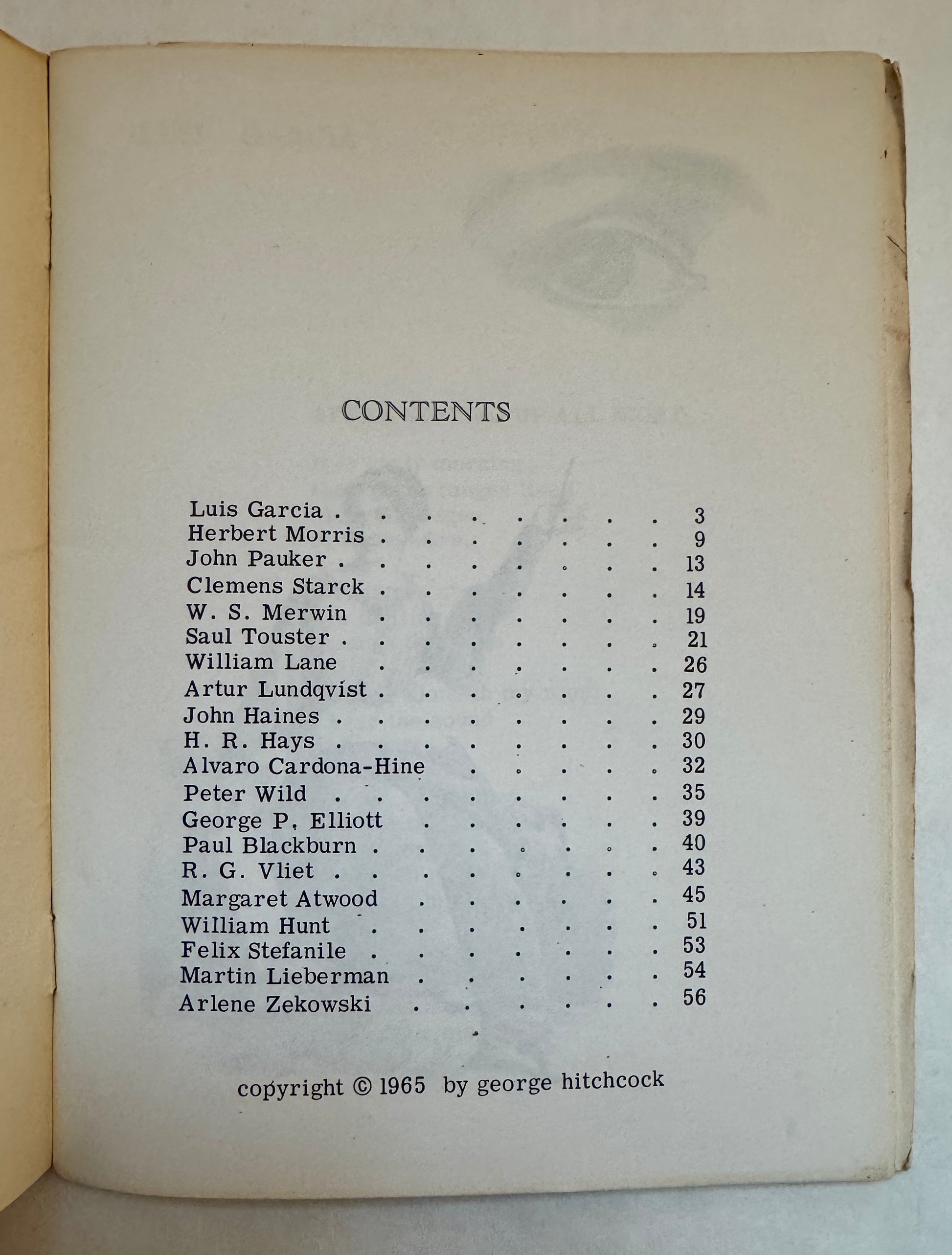 See photos for tabel of contents or list of contrubutors. George Hitchcock (1900–1999) was an American poet, printer, and publisher best known as the founder of the Kayak Press and editor of Kayak, a fiercely independent poetry journal launched in 1964. Working largely from Big Sur, he championed a handmade, artisanal approach to printing that fused letterpress craft with an uncompromising literary stance, publishing and promoting voices often neglected by mainstream outlets. His own poetry, spare and incisive, reflects a modernist temperament shaped by isolation, rigor, and a distrust of literary fashion. Through Kayak and the press that surrounded it, Hitchcock exerted an influence disproportionate to its scale, becoming a key figure in the West Coast small-press movement of the mid-to-late twentieth century. | American poetry magazines; poetry journals, poetry serials. California poetry,1960s-1970s