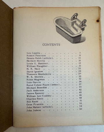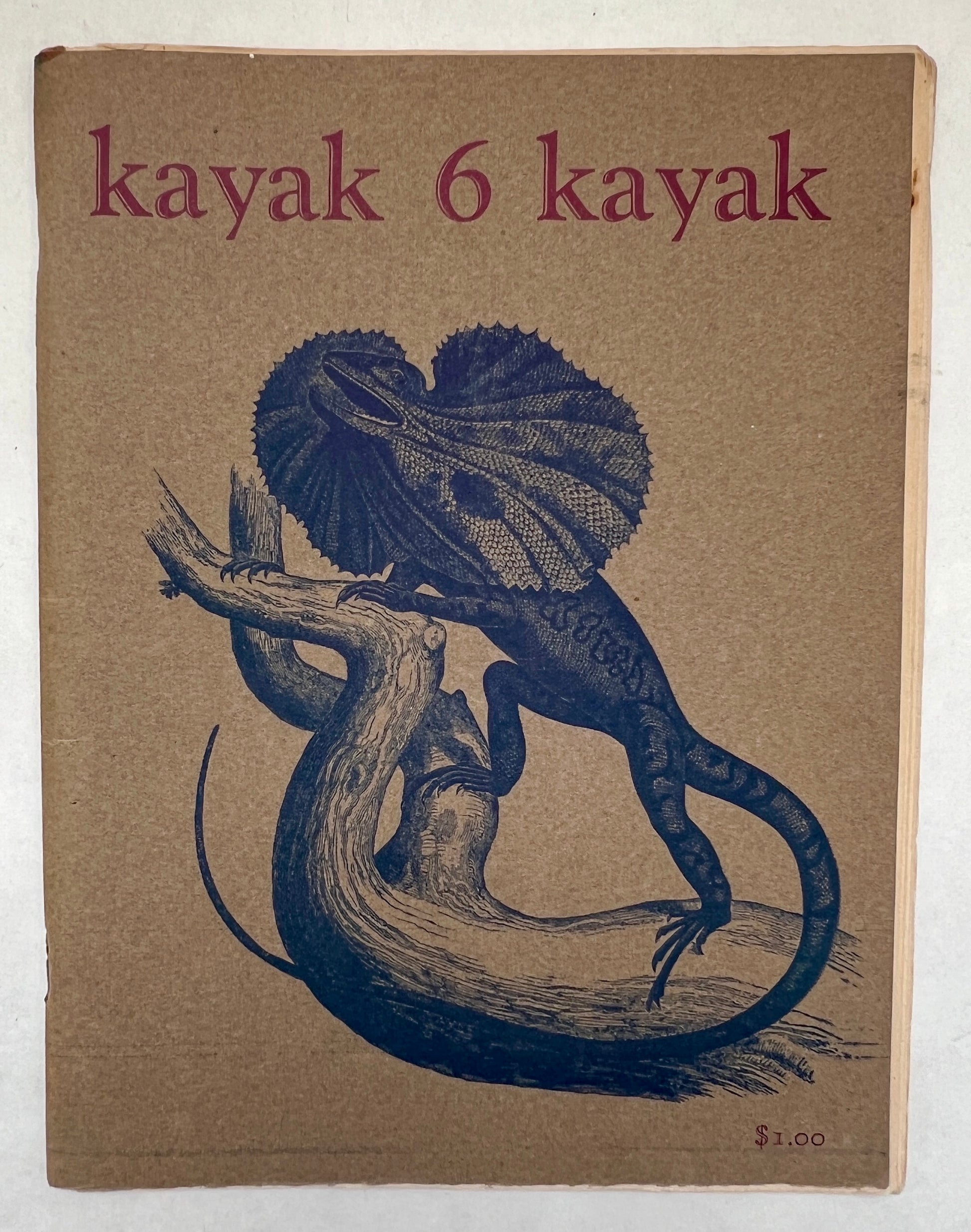 See photos for tabel of contents or list of contrubutors.\ George Hitchcock (1900–1999) was an American poet, printer, and publisher best known as the founder of the Kayak Press and editor of Kayak, a fiercely independent poetry journal launched in 1964. Working largely from Big Sur, he championed a handmade, artisanal approach to printing that fused letterpress craft with an uncompromising literary stance, publishing and promoting voices often neglected by mainstream outlets. His own poetry, spare and incisive, reflects a modernist temperament shaped by isolation, rigor, and a distrust of literary fashion. Through Kayak and the press that surrounded it, Hitchcock exerted an influence disproportionate to its scale, becoming a key figure in the West Coast small-press movement of the mid-to-late twentieth century. | American poetry magazines; poetry journals, poetry serials. California poetry,1960s-1970s