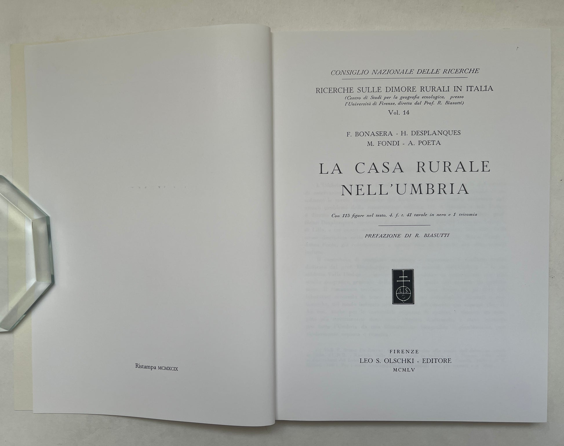 In Italian. Volume 14 of the Ricerche sulle dimore rurali in Italia series, is a meticulous architectural and ethnographic study of traditional Umbrian farmhouses. Drawing on extensive field surveys, Bonasera documents the evolution of rural dwellings across plains, hills, and the Trasimeno basin, analyzing their construction materials, spatial layouts, and adaptation to agricultural life. Through photographs, measured plans, and descriptive commentary, he reveals how these houses embody a deep synthesis of geography, craft, and social organization—stone walls and terracotta roofs expressing both utility and regional identity. The book stands as a foundational work in Italian vernacular architecture studies, preserving the memory of an agrarian culture that shaped the Umbrian landscape for centuries.