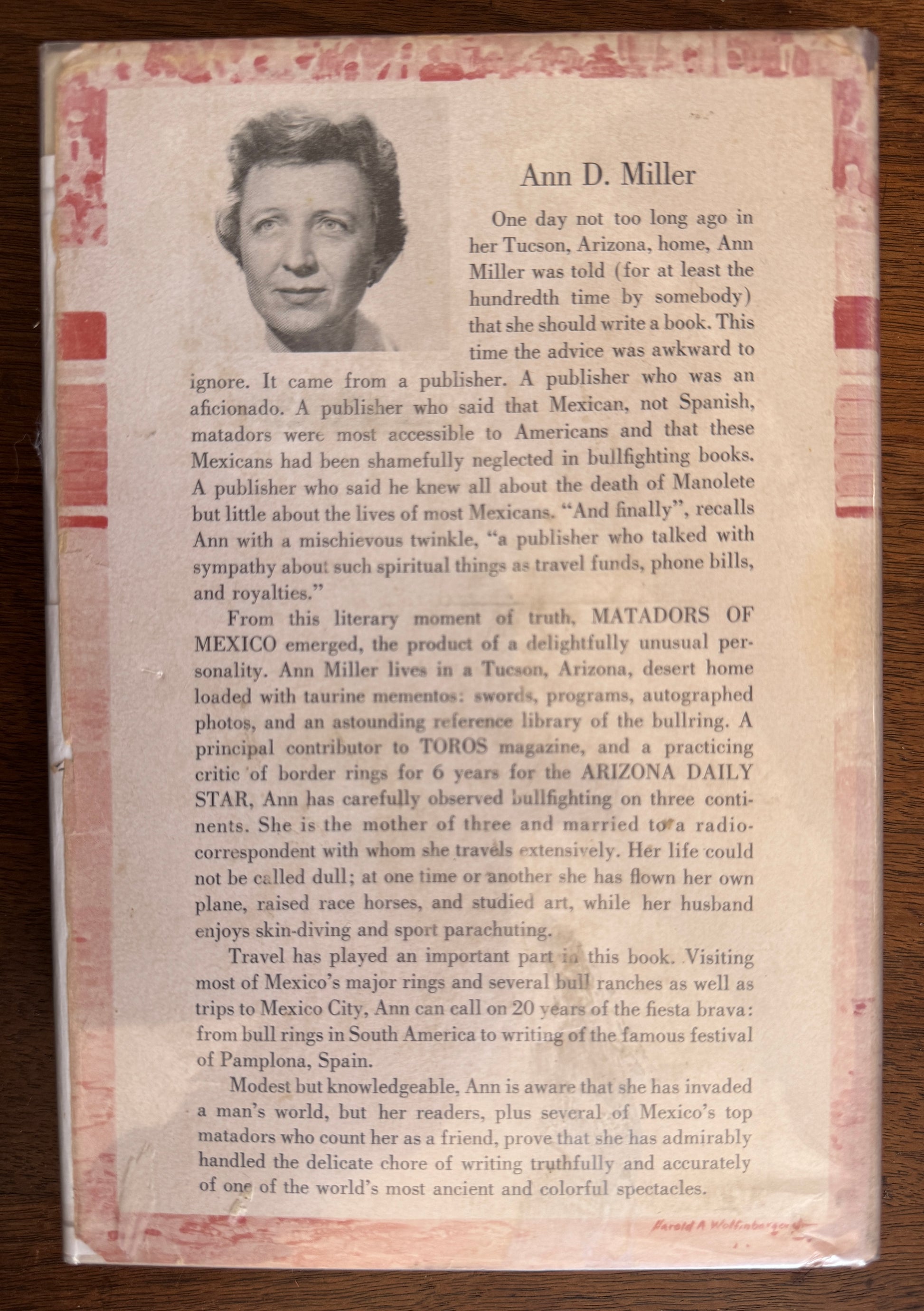 Text in English. Signed and Inscribed by author in year of publication. Altogether and handsome copy of this lavishly illustrated work, with black and white photos and histories of Mexico's most prominent matadors of the time. // Bullfights; Bullfighters. Book design and drawings by Harold A. Wolfinbarger, Jr