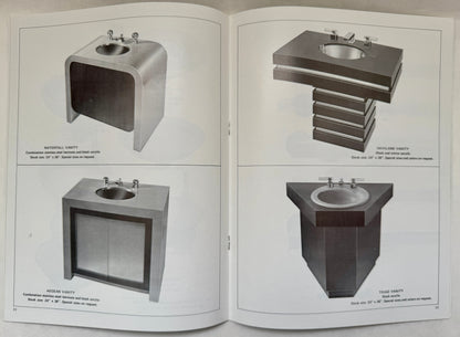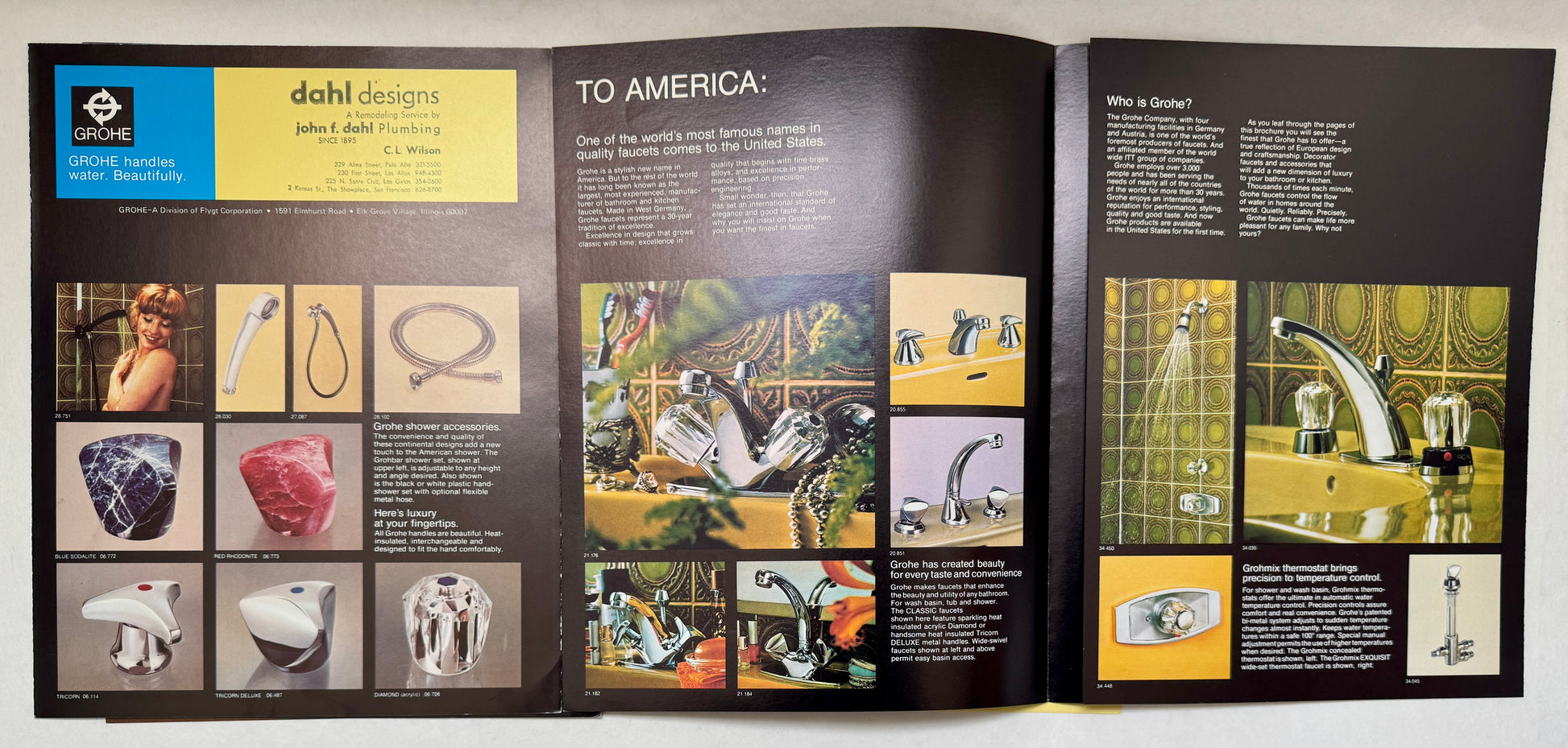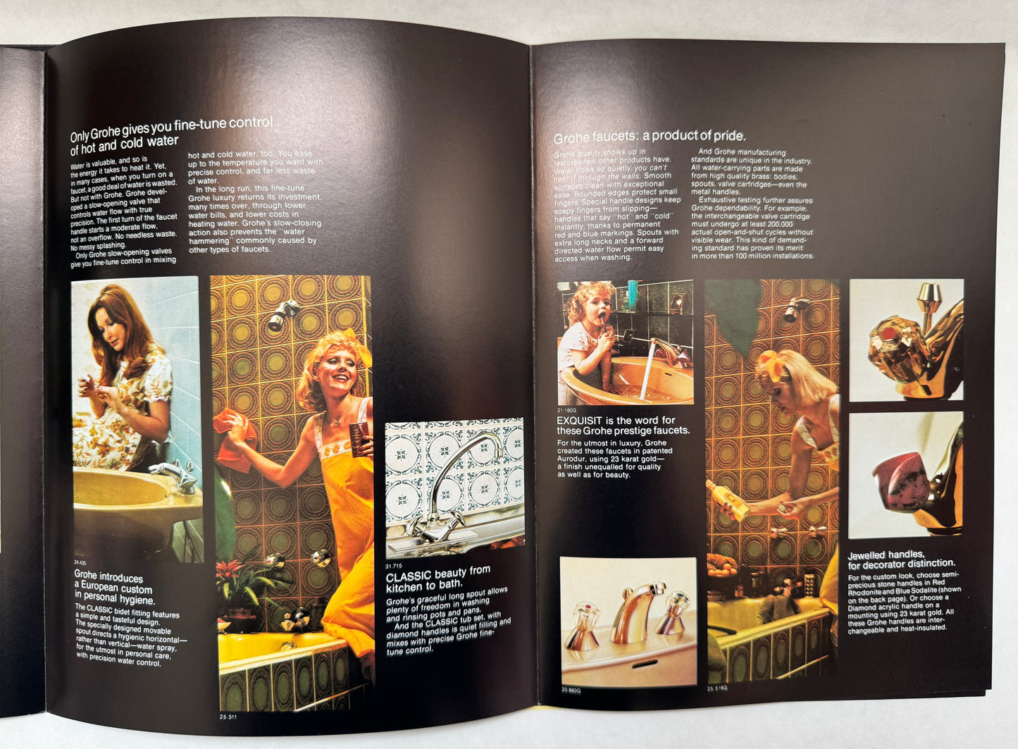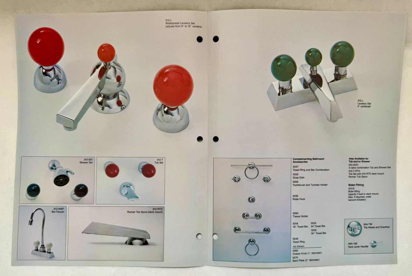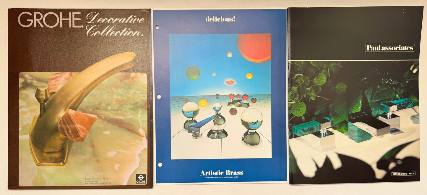 Contents: Grohe Decorative Collection; Delicious! Artistic Brass; Paul Associates. All appear to be from late 60s to 70s. Orbs, spirals, floral, marble - explore the variety of decorative options exist for sinks. Great for the renovator who wants a touch of yesteryear in their water closet.