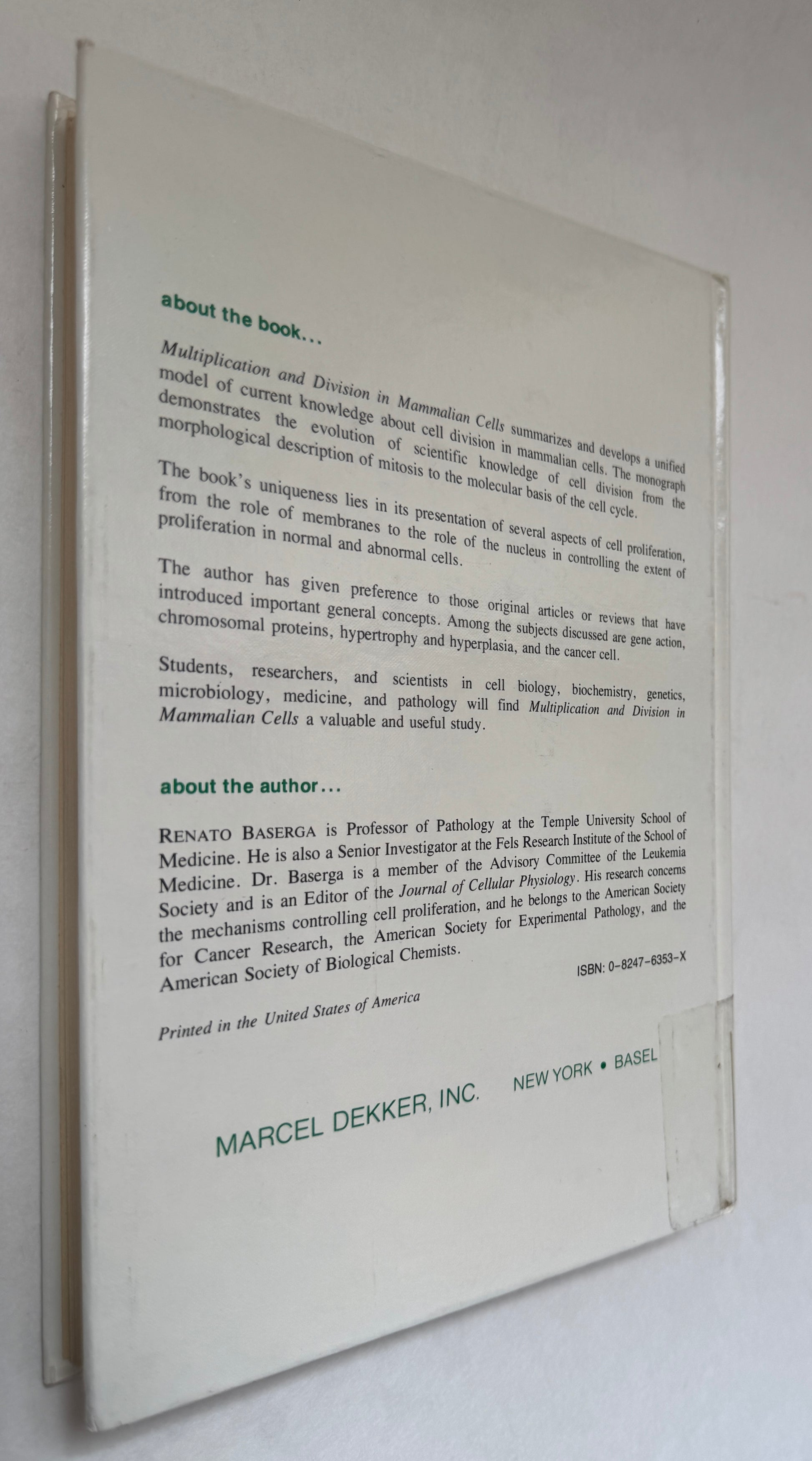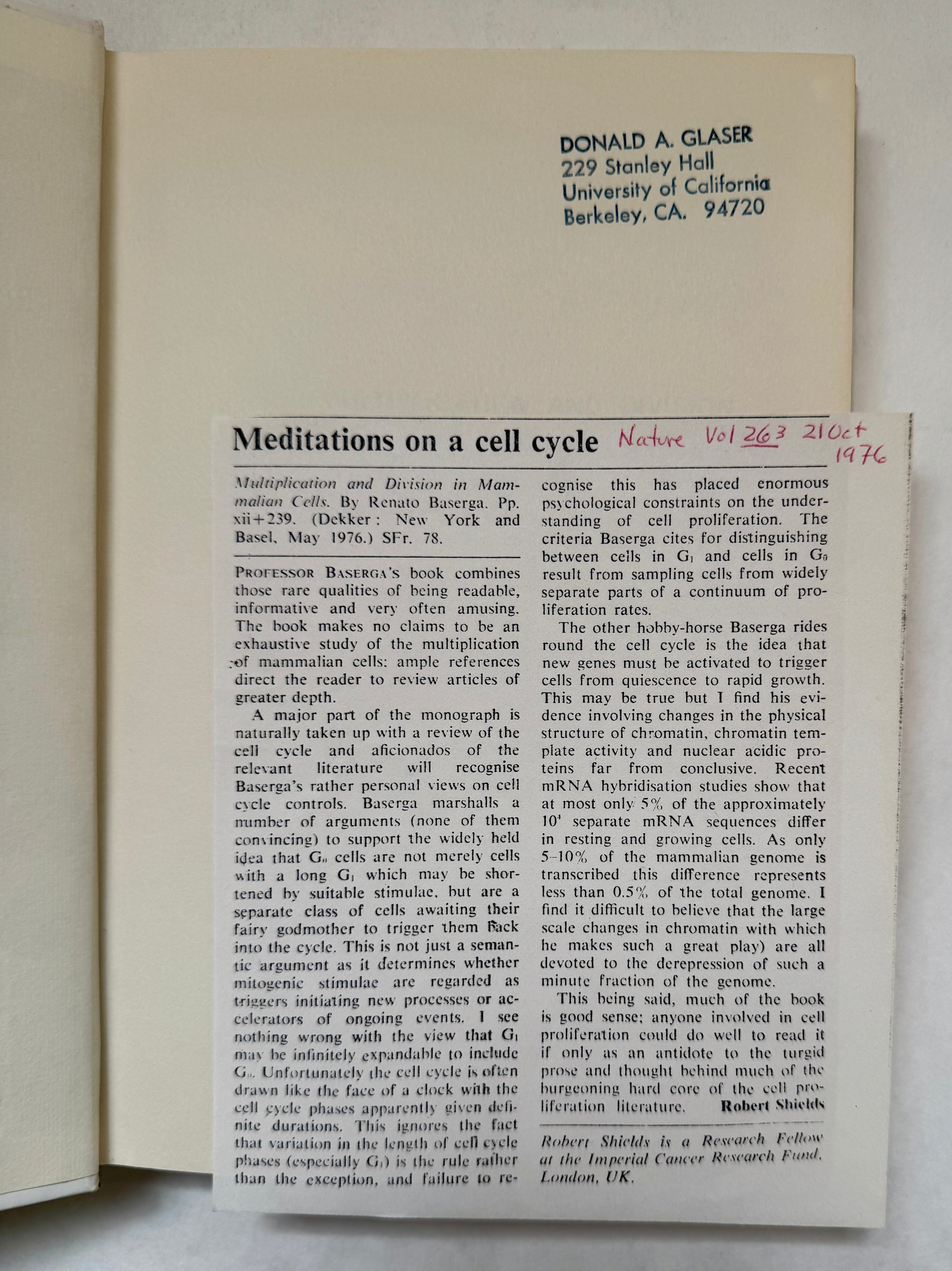 Volume 6 in the Biochemistry of Disease. Nobel Laureate Donald Glaser's copy, with his name stamp to front free endpaper and also a spine label of his personal research library. For more books from Glaser's library, search using the keycode: GLSR. Glaser won the Nobel Prize for Physics in 1961 for the invention of the Bubble Chamber. // From the preface: "I [...] went quietly from morphology to biochemistry, something which made me known as an intruder among biochemists, and as a trator among pathologists. But it is, in fact, this dual background that encourages me to write this monograph in order to show how our knowledge of cell division has gone from the morphological description of mitosis to the molecular basis of the cell cycle. The protagonist of the booklet is the dividing mammalian cell and I will refer to bacteria adn lower animals only when necessary for a better understanding of molecular processes."