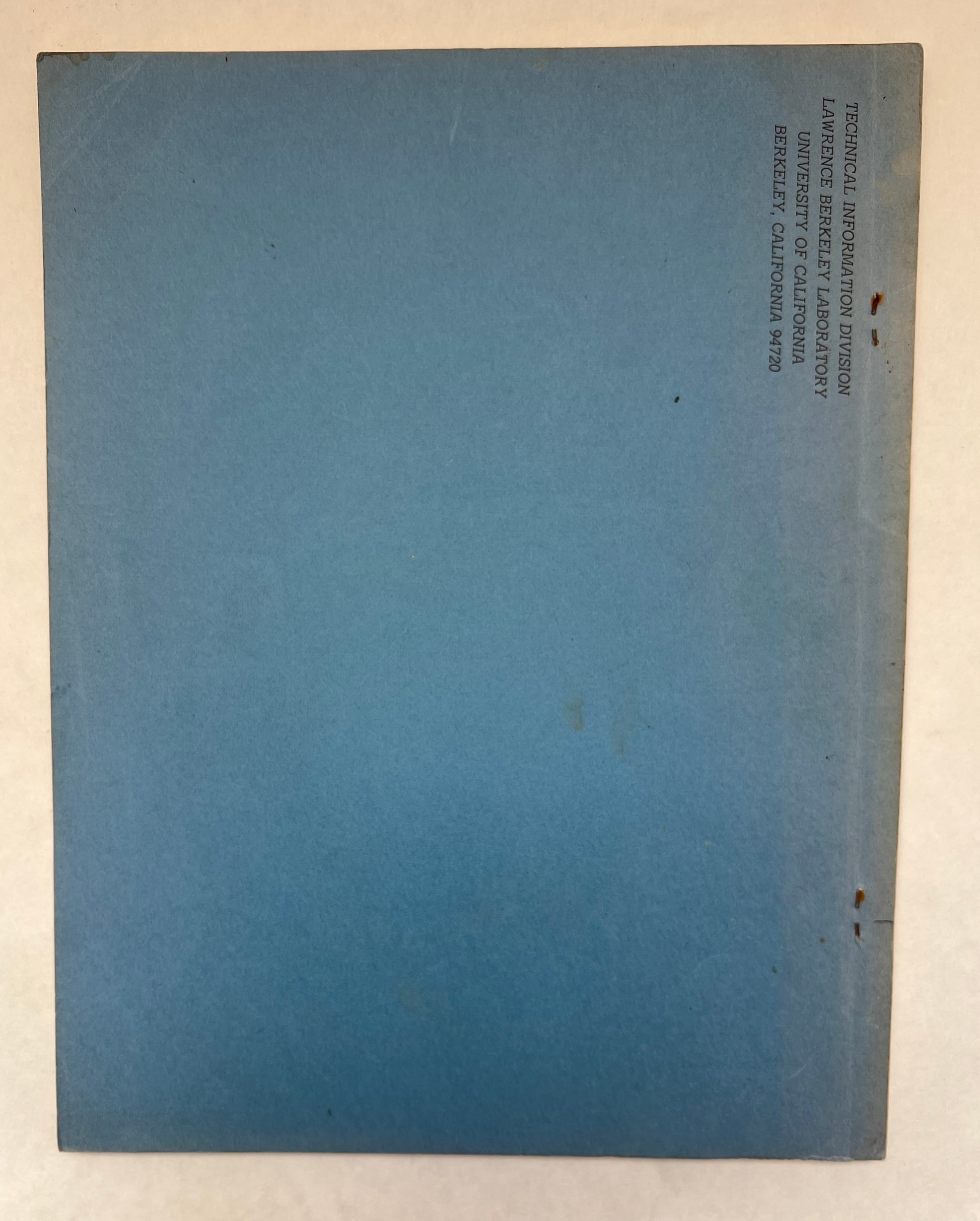 Berkeley, CA: Lawrence Berkeley National Laboratory, UC Berkeley, 1973. 1st Edition. Quarto in blue paper stapled wraps; 110p; tables; 28cm Very good; some reading creases; wraps sunned at spine; rusting to staples; else clean and tight. Stapled wraps.