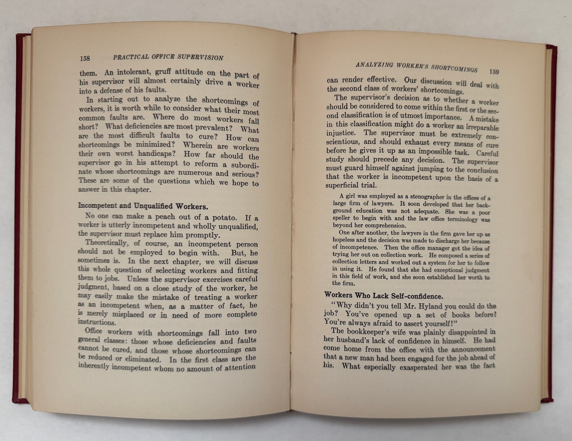 Scarce. "The past two decades have seen tremendous stridesin the elimination of waste motion, the upbuilding of morale, and the improvement of human relations among manual workers. We have learned a great deal about ways and means of enlisting full cooperation of factory workers. In the office, however, progress has not kept pace. The very nature of office work has made it easier for the office worker to be more inefficient without losing his job." --Introduction. Contents: The Office Supervisor, What an Office Worker Expects of his Supervisor, Cultivating Team Spirit, Eliminating Office Irritations, Office Environment, Making the Office Comfortable, Office Discipline, Analyzing Workers' Shortcomings, Selecting and Breaking in New Employees, Promotions, Securing and Using Suggestions, Getting Results through Non-Financial Incentives.
