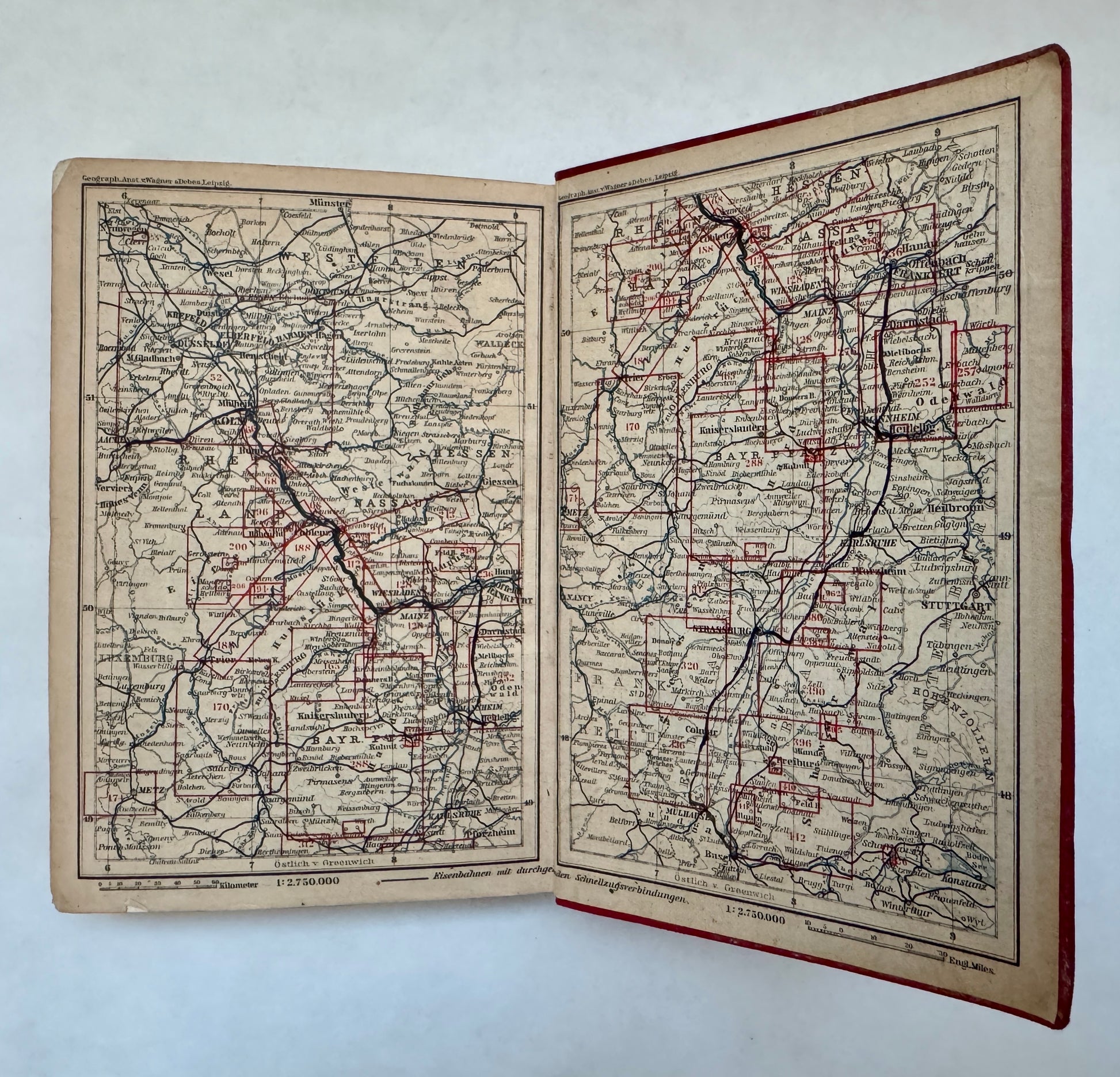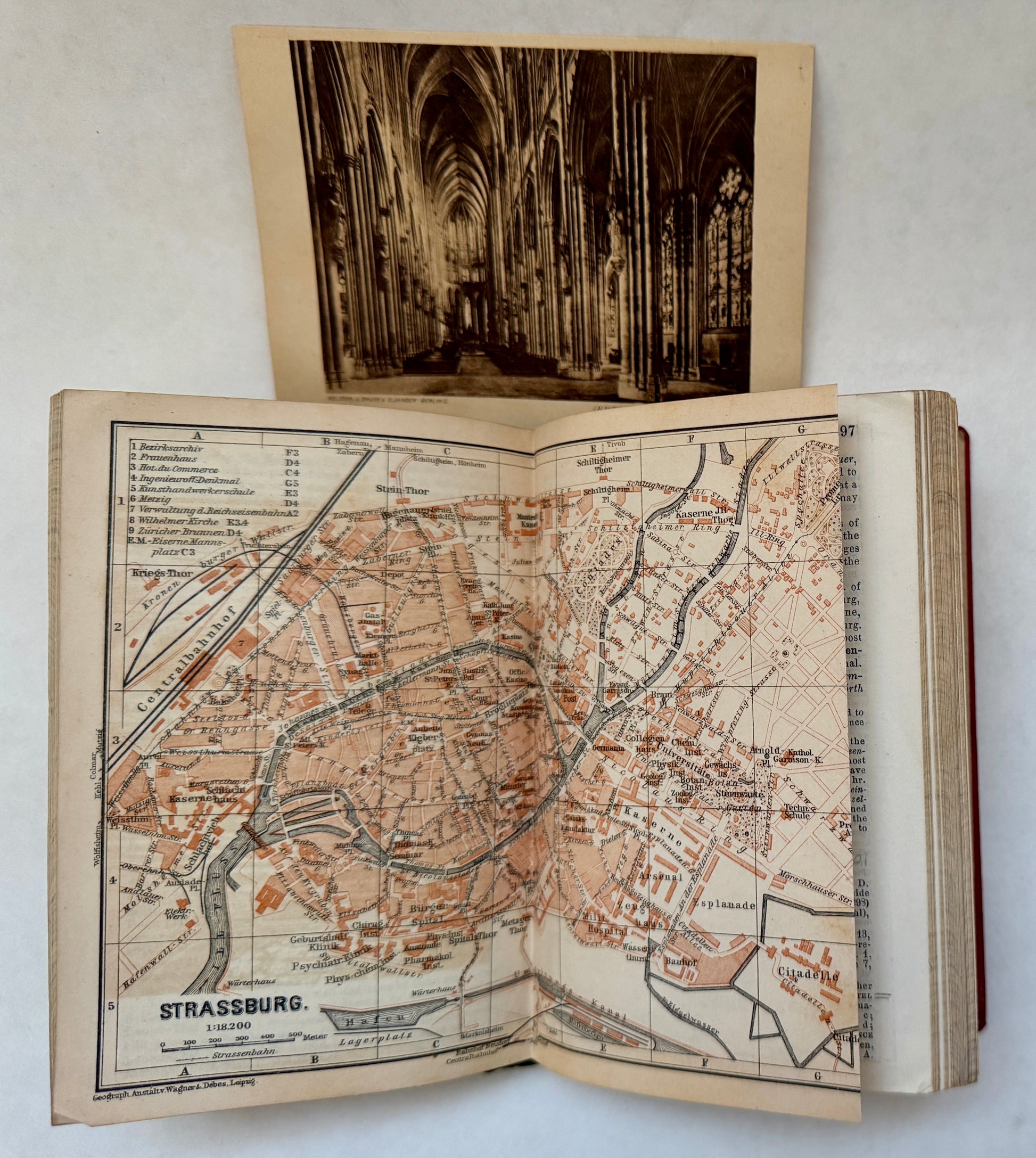 London: K. Baedeker; Dulau & Co., Leipsic, 1900. Fourteenth Revised Edition. 12mo in red cloth, gilt titles; 448 pp: 45 maps, 25 plans; 16 cm. Marbled textblock; green silk ribbon marker. Relevant postcard of same period and place laid in. Very good to vg(-), with mild wear to edges; ; light pencil to flyleaf else pages clean; binding tight. Limp leather.
