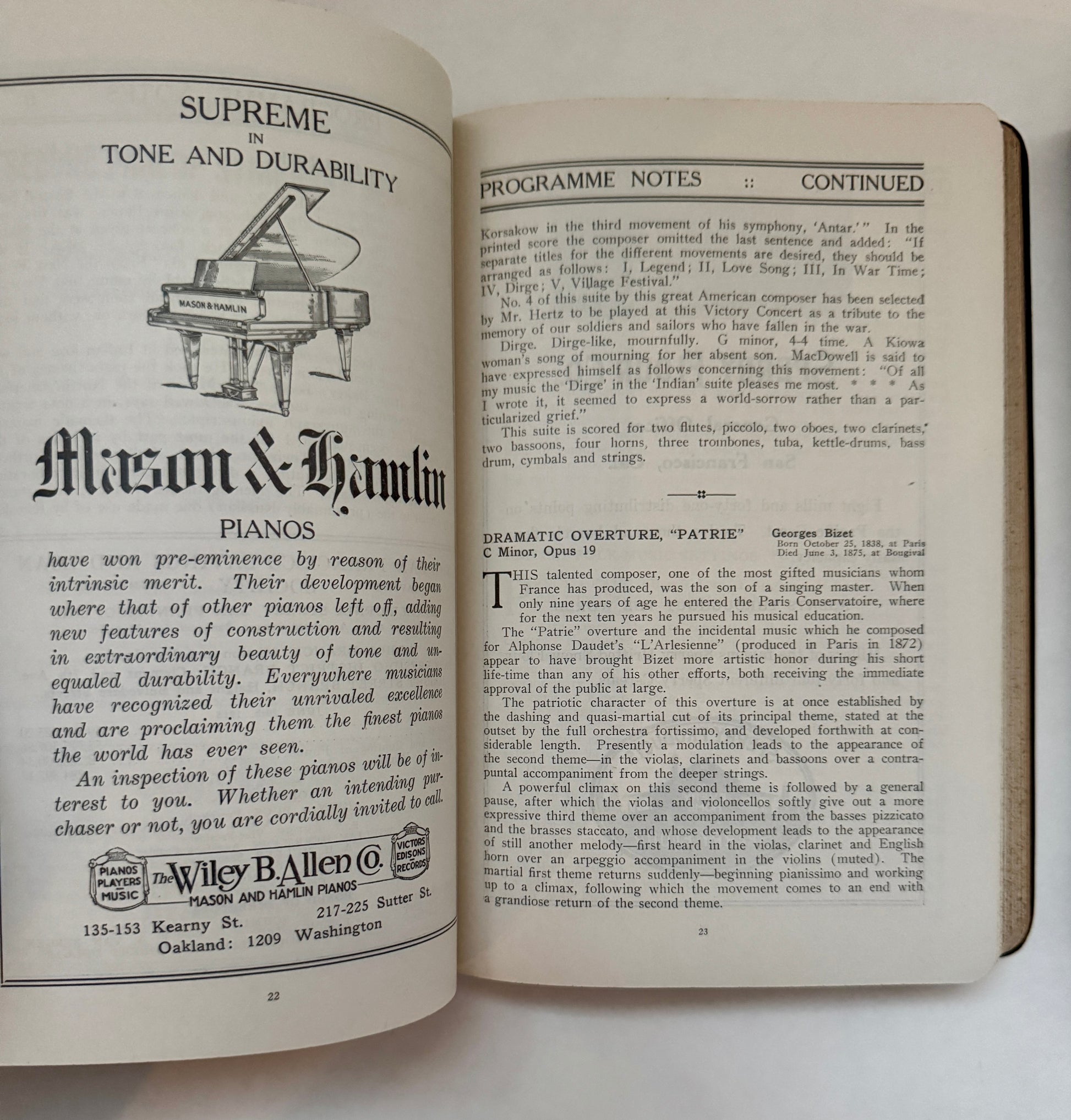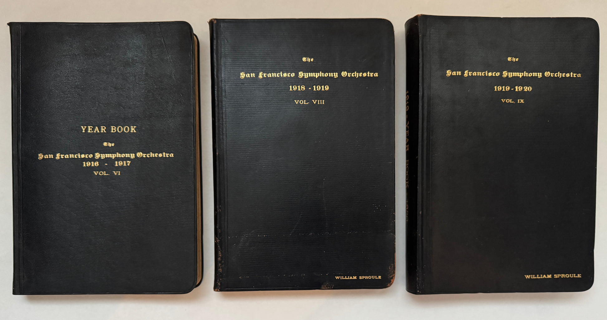 Three custom bound volumes of the Symphony's program notes in limp leather. Alfred Hertz was conductor for all three seasons. One volume inscribed to William Sproule; two with his name stamped in gilt to front. Lists musicians, concerts, and includes ads and other writings included in programs for concerts. Presumably quite scarce thus.