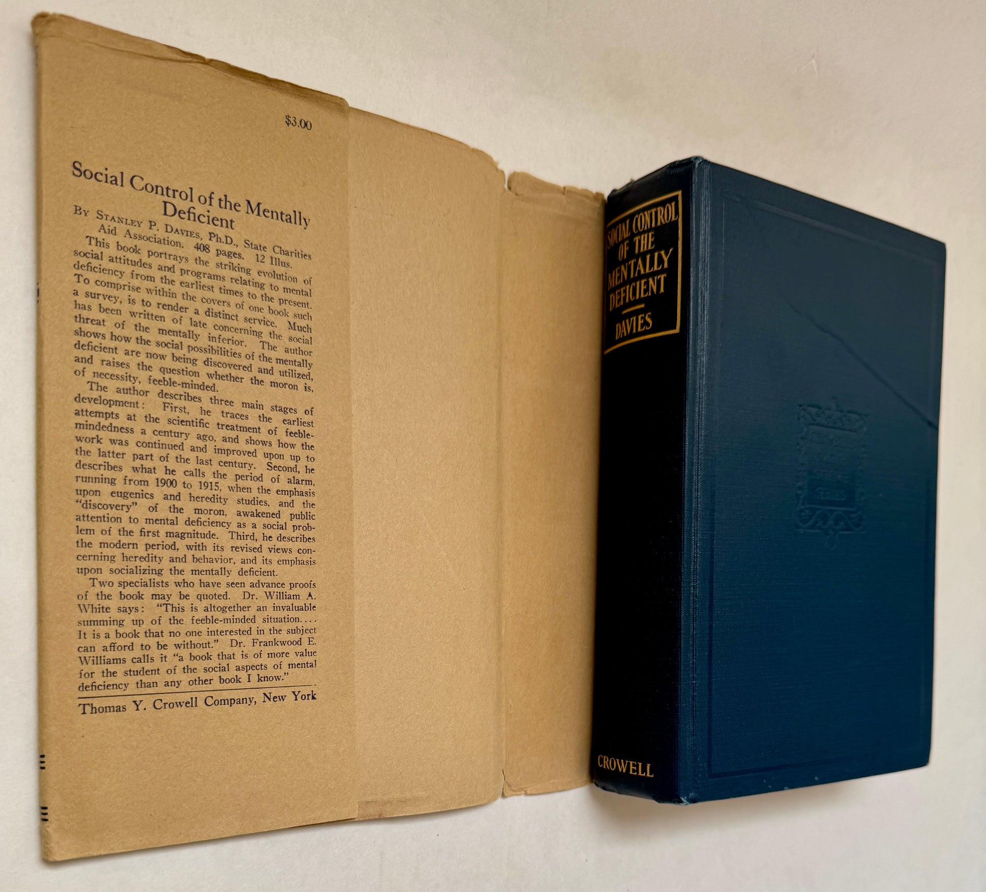 Scarce. A document from a different era in the treatment and language surrounding special needs and disabilities. Part of the Crowell's Social Science Series. From the jacket: "The nature of the mental defect, its possible extent in the United States, the problems to which it gives rise, and the measures whereby it can be brought under social control are treated in this volume. The discussion is based on an examination of the best evidence relative to the subject, and may be accepted as authoritative, It clearly shows how the troublesome problems in this field can be treated in the interests of society at large and of mental defectives themselves. Moreover, in describing the results achieved through the deliberate control of conditions affecting mental defectives, this volume throws considerable light on the time-honored question of the parts played, in development, by hereditary and environmental influences respectively.".