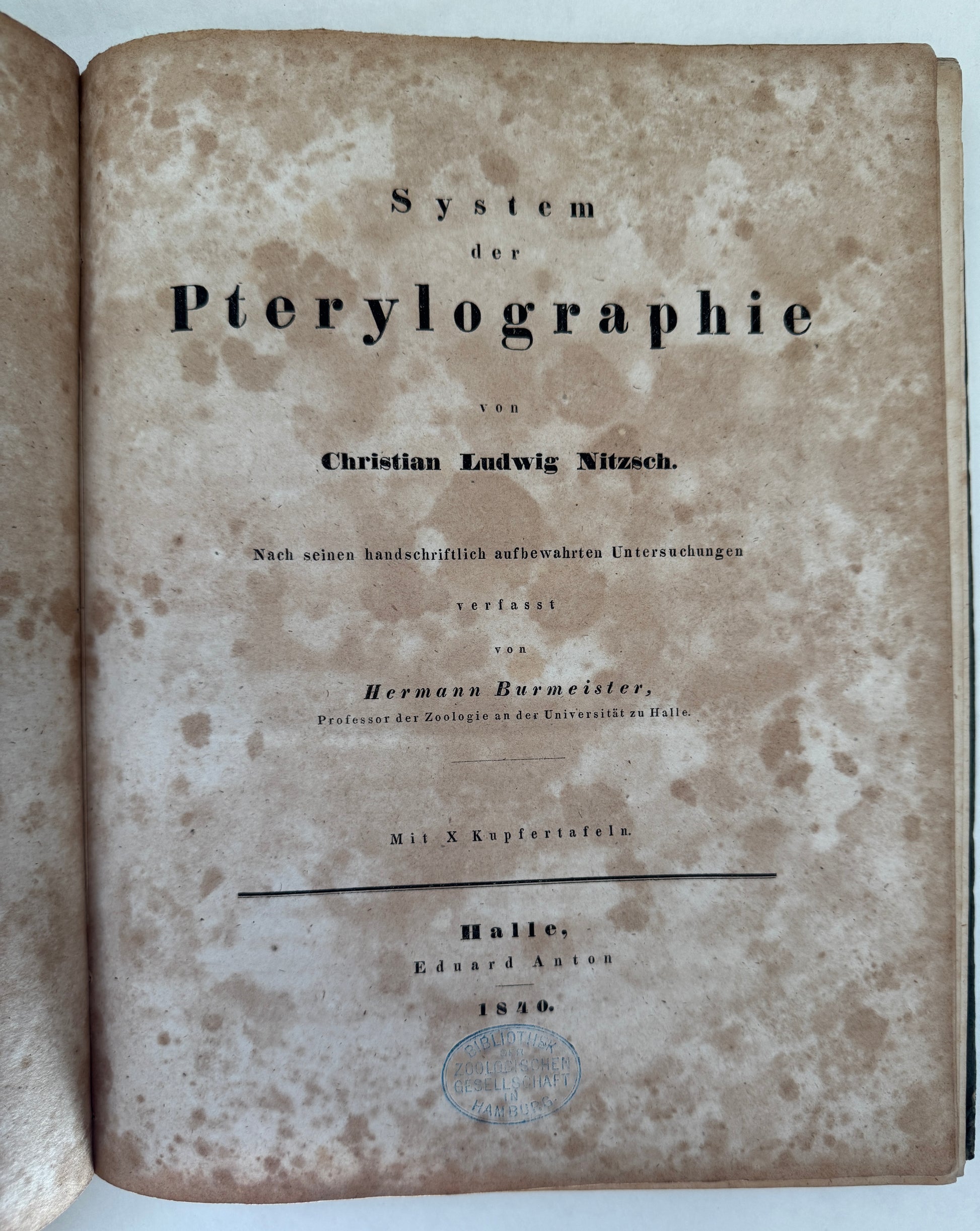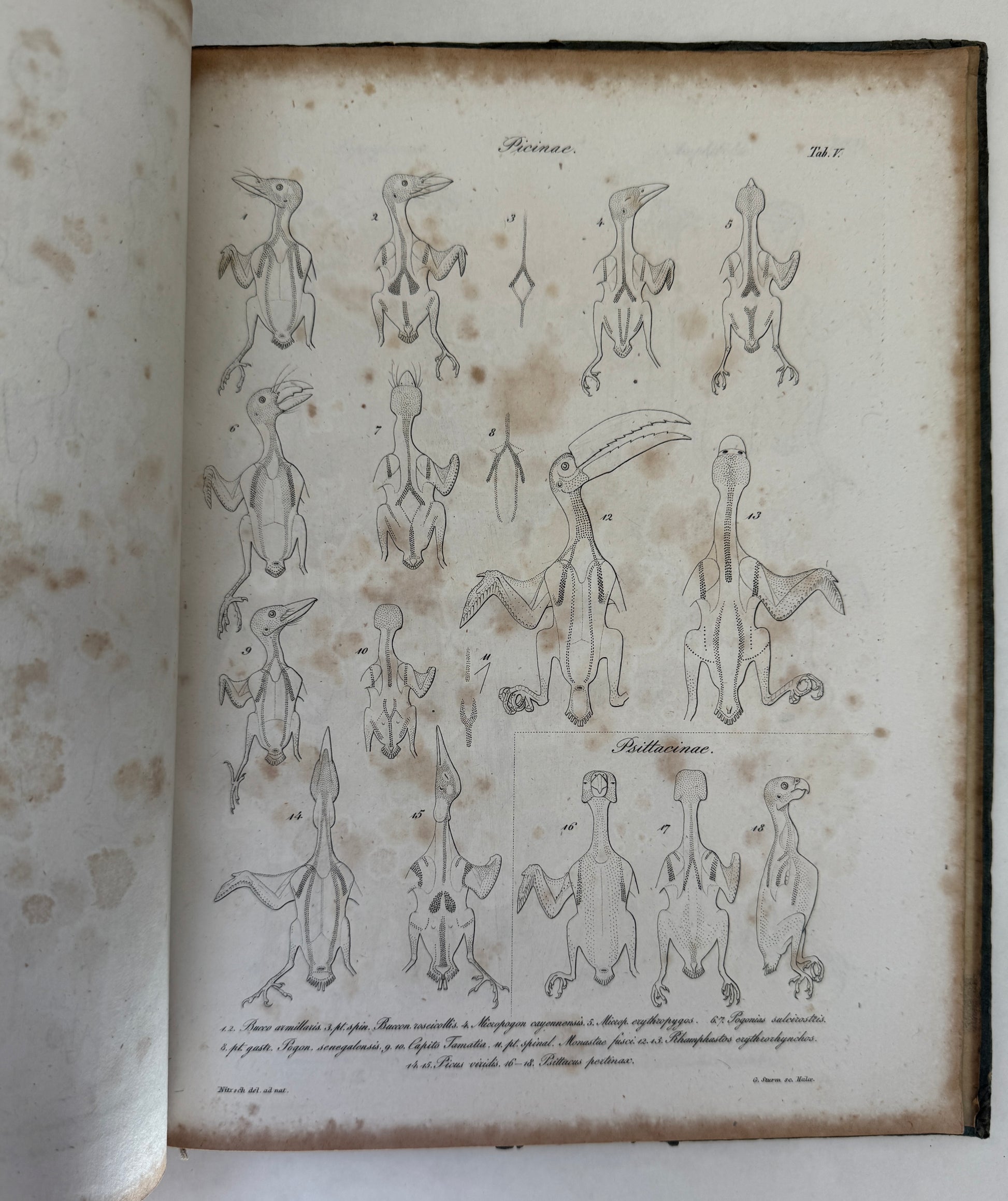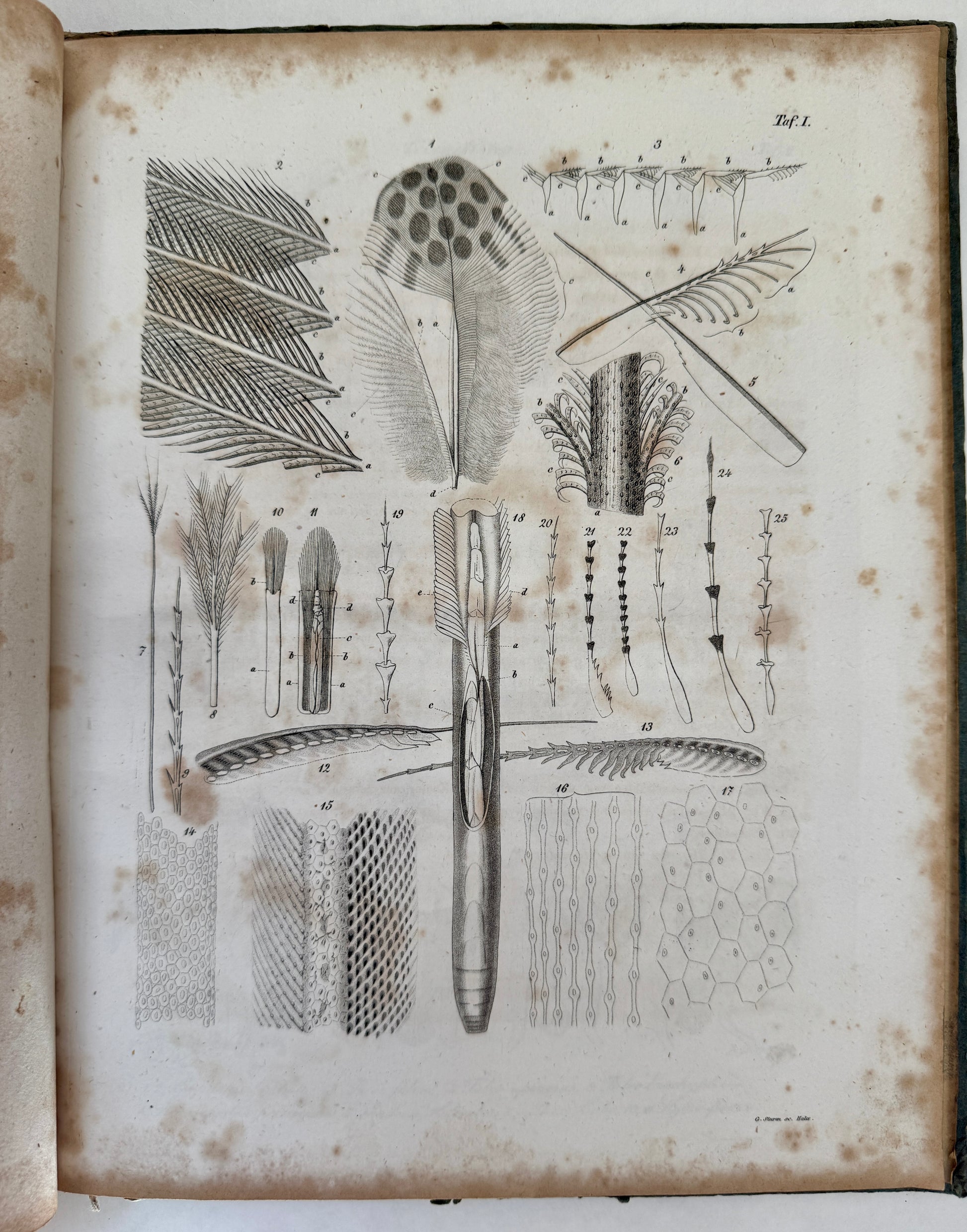In German. Scarce. A revision of the author's Pterylographia avium pars prior, of which only one part was published in 1833, edited by Burmeister with the addition of an extra plate. Formerly part of the Bibliothek der Zoologischen Gesellschaft in Hamburg. Delicate linework shows the pattern of feathers on a variety of birds.