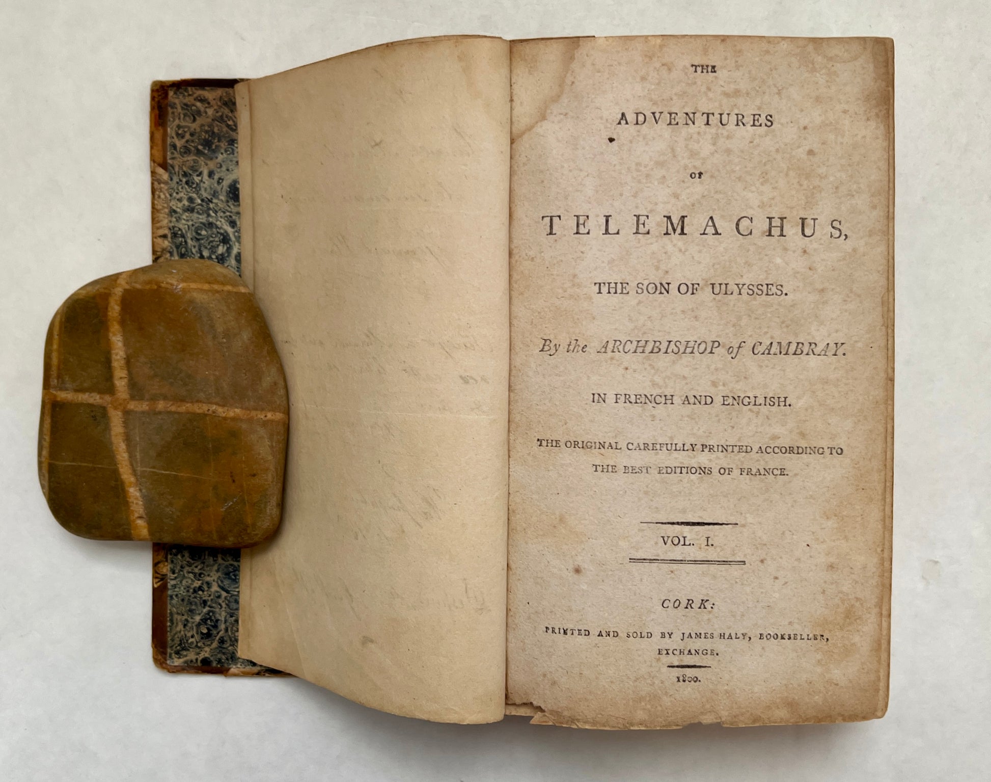 An uncommon Irish edition of this classic, originally written in French and titled: Les Aventures de Télémaque, fils d'Ulysse (1699). Complete thus as a single volume. Multiple title pages. Parallel French and English texts. No maps or illus. | Early Irish imprint. | "A didactic novel by François Fénelon, Archbishop of Cambrai, who in 1689 became tutor to the seven-year-old Duc de Bourgogne (grandson of Louis XIV and second in line to the French throne). It was published anonymously in 1699 and reissued in 1717 by his family. The slender plot fills out a gap in Homer's Odyssey, recounting the educational travels of Telemachus, son of Ulysses, accompanied by his tutor, Mentor, who is revealed early on in the story to be Minerva, goddess of wisdom, in disguise."—Wikipedia. | Greek Mythology
