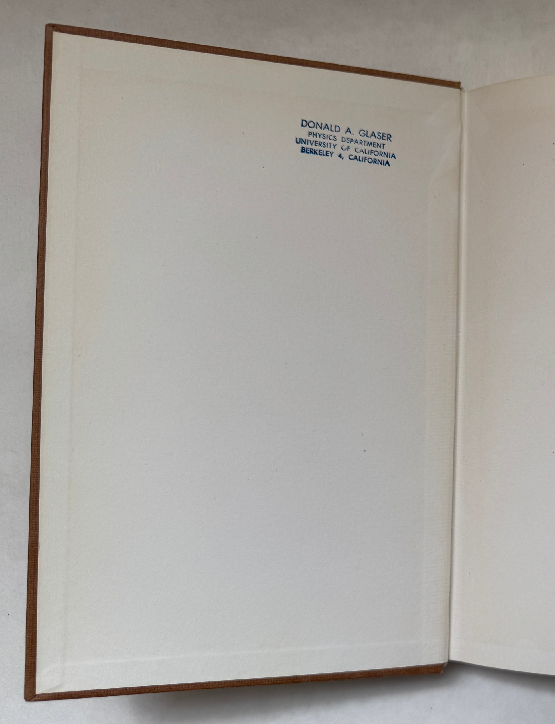 Nobel Laureate Donald Glaser's copy, with his name stamp to front pastedown and also a spine label of his personal research library. For more books from Glaser's library, search using the keycode: GLSR. Glaser won the Nobel Prize for Physics in 1961 for the invention of the Bubble Chamber.