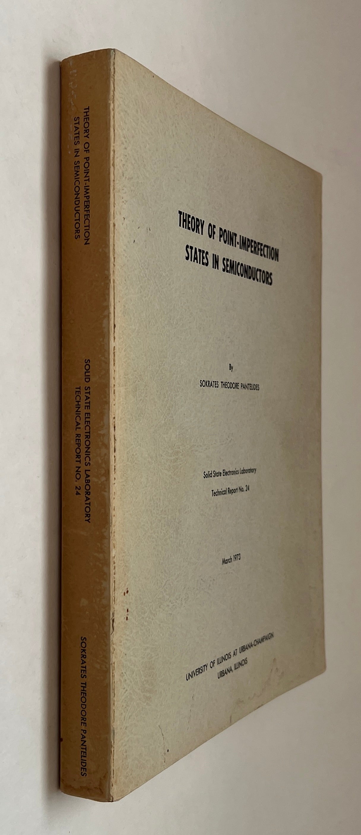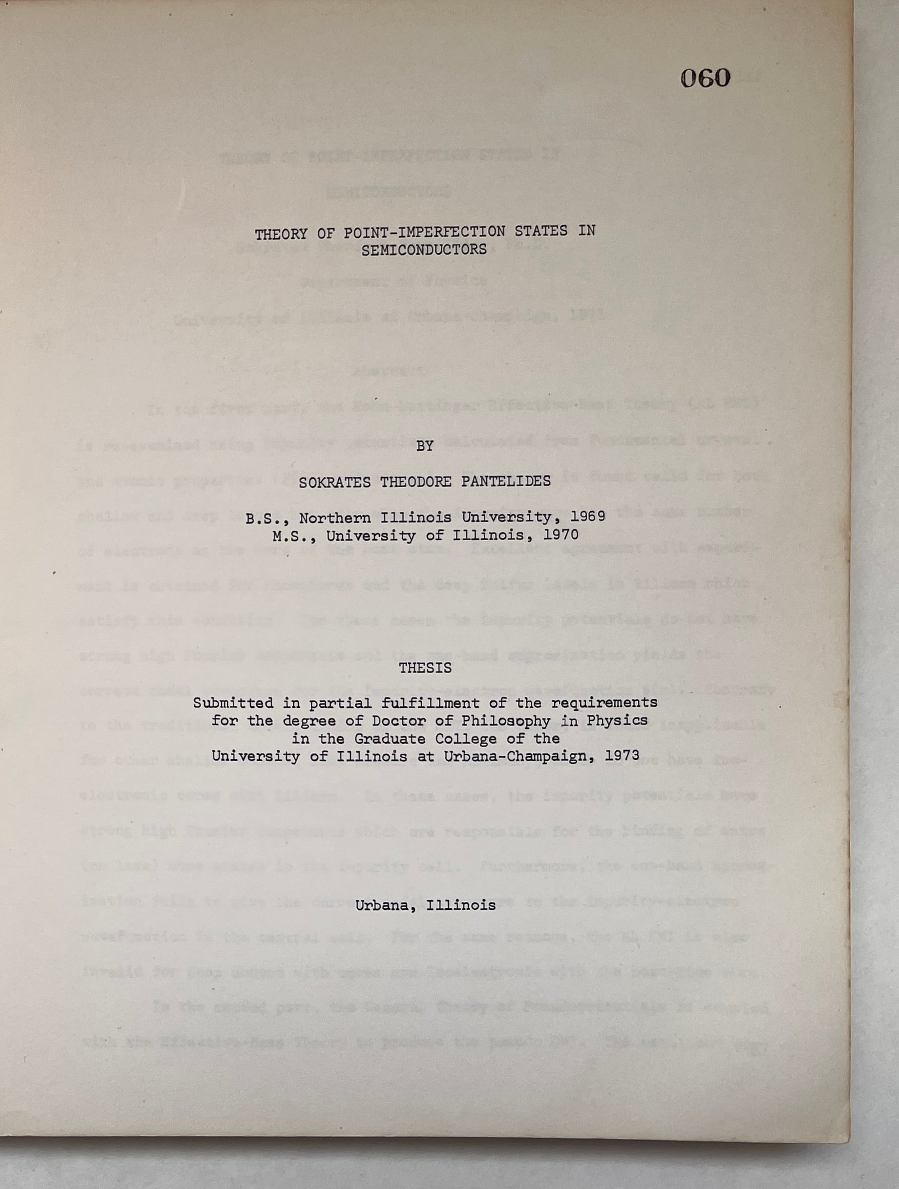 Scarce. PhD Dissertation | Sokrates Theodore Pantelides, also known in academic and scientific circles as Sokrates T. Pantelides—was a distinguished physicist and engineer. Born on November 20, 1948, in Limassol, Cyprus, he later became an American national. He earned a BSc in Physics with Highest Honors from Northern Illinois University (1969), followed by an MSc (1970) and a PhD in Physics (1973) from the University of Illinois . After a lengthy tenure at IBM’s research division in Yorktown Heights—progressing from research staff member to senior manager and technical assistant to the vice president for science and technical affairs between 1975 and 1991—he transitioned to academia at Vanderbilt University in Nashville beginning in 1994 . At Vanderbilt, he eventually became the William A. and Nancy F. McMinn Professor of Physics, later chairing the Department of Physics and Astronomy, and serving as a distinguished visiting scientist at Oak Ridge National Laboratory .Pantelides’s recognition extends through numerous prestigious honors as a Fellow of several leading professional societies, including the Institute of Electrical and Electronics Engineers (IEEE, American Physical Society, Materials Research Society, and American Association for the Advancement of Science .